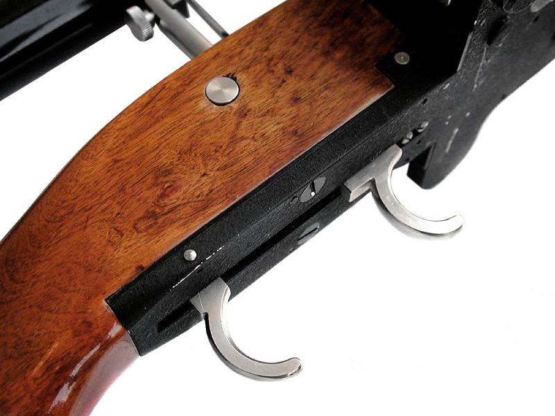 Particolare dei due grilletti, il primo dei quali, dotato di corsa lunga, riarma l’apparecchio.
