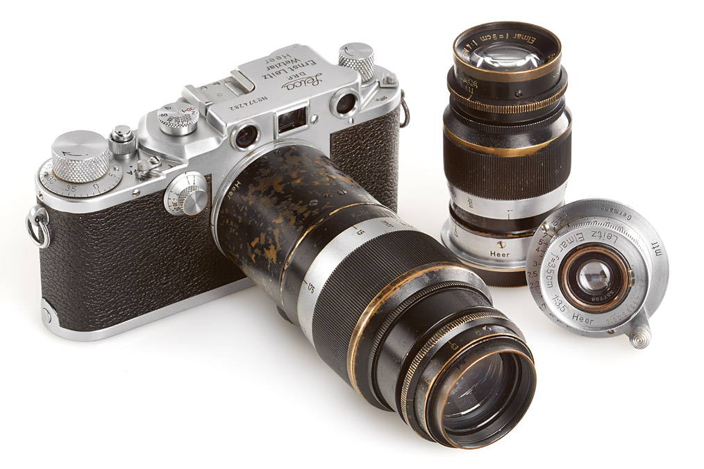 - Leica IIIc marcata Heer sul carter superiore, fornita a Berlino con nr 25482 il 24 maggio 1941, completa di ottica grandangolare Elmar 3,5/3,5, marcata Heer sulla ghiera frontale, consegnata il 28 maggio 1941, Elmar 9cm f/4, e Hektor 13,5cm f/4,5, ambedue marcati Heer sul barilotto.