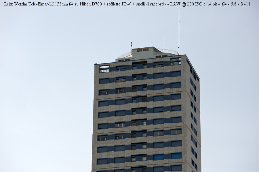 foto 22 - Il file RAW-NEF a 14 bit della Nikon D700 e' materiale da leccarsi i baffi e permette al vetusto Tele-Elmar-M di mettere in evidenza le doti che tutti gli hanno sempre riconosciuto: innanzitutto, grazie ad una copertura abbondante, solo parzialmente sfruttata nella piu' corretta porzione centrale, l'immagine presenta una resa omogenea, brillante ed uniforme sull'intero fotogramma, con una rimarchevole brillantezza cromatica (considerando l'anzianita', l'antiriflessi di vecchia generazione e la primitiva passivazione dell'iride), un elevato contrasto ed una soddisfacente correzione dell'astigmatismo e della distorsione (quest'ultima praticamente inavvertibile), tutti parametri che si avvantaggiano dello sfruttamento sostanzialmente assiale di una proiezione ridondante.