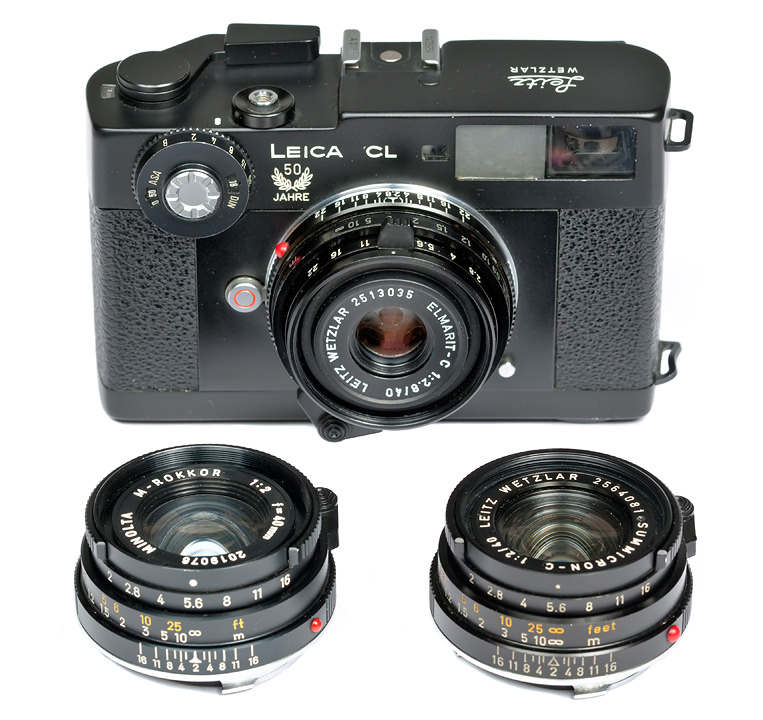 I tre 40mm assieme all'Elmar-C 90mm f/4 montati su vari modelli di Leica CL (Leitz-Minolta, "50 Jahre", "Attrappe" da esposizione): la Leica CL Giubileo "50 Jahre" fu realizzata nel 1975 in 3.500 esemplari, mentre la versione Attrappe (manichino) è un modello da vetrina, privo di meccanismi interni, e nella fattispecie è facilmente identificabile anche senza maneggiarlo grazie alla lettera "A" anteposta al numero di matricola sulla slitta porta-accessori. La gestione delle ottiche è curiosa: il 40mm f/2 M-Rokkor era prodotto in Giappone, ma non vi sono indicazioni precise sull'origine delle lenti (se prodotte a Wetzlar o realizzate da Minolta autonomamente), il 40mm f/2 Summicron-C era realizzato a Wetzlar mentre il medio tele da 90mm f/4 era costruito in Germania sia nell'esecuzione Elmar-C per Leica CL sia in quella M-Rokkor per Minolta CL, che riportava l'incisione "made by Leitz", unico caso di ottica originale Leitz rebranded.