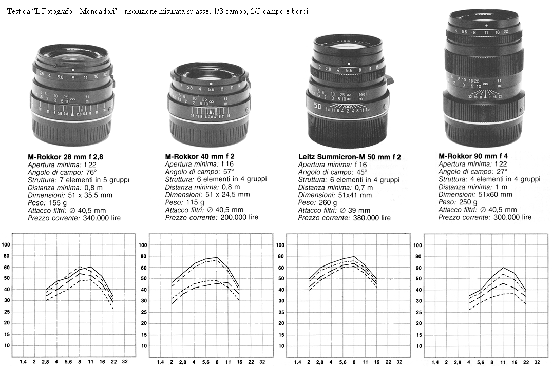 I valori di risoluzione del 28mm e del 90mm non sono eccezionali e mi fanno sospettare qualche problema/staratura del sistema di messa a fuoco o delle camme (le prove venivano effettuate direttamente su pellicola ed in questo caso venne utilizzata una Minolta CLE), mentre è interessante confrontare il comportamento del 40mm f/2 con il Summicron-M 50mm f/2, dotato di uno schema analogo: sull'asse e fino ad 1/3 di campo al risoluzione fu sovrapponibile, evidenziando un fingerprint analogo ai vari diaframmi, mentre a 2/3 di campo ed ai bordi il 40mm presentò una risolvenza decisamente inferiore, forse - come accennato - pagando la forzatura a 57° del suo schema.Peraltro, il 28mm f/2,8 M-Rokkor risultò invece eccellente in un altro test, basato su letture MTF dell'immagine aerea e non influenzato da problemi di messa a fuoco sul corpo macchina: ad inizio anni '80 la rivista italiana "Tutti Fotografi" mise a confronto l'M-Rokkor 28mm f/2,8 con il Leitz Elmarit-M 28mm f/2,8 terzo tipo, codice 11804, ed il Rokkor risultò globalmente superiore (nella media fra asse, zone medie e bordi) da f/2,8 ad f/5,6, impattando poi con l'Elmarit-M alle aperture successive; ecco copia di quei test risalenti a quasi 30 anni fa.