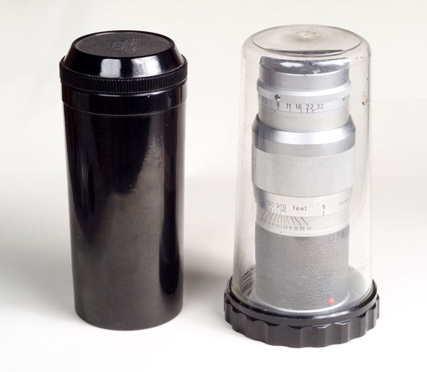-6 esemplare del 1956, barilotto accorciato a 11cm, con vulcanite, passo filtri E39. Ghiera dei diaframmi a scatto, scritte invertite all’interno della testa ottica. Peso 400g.