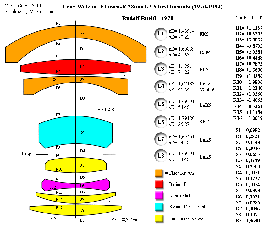 L'Elmarit-M 28mm f/2,8 seconda serie del 1969 non differisce drasticamente dai concetti sui quali si basa il primo tipo a 9 lenti del 1965, ma tutta la priorità del progetto fu volta al conseguimento di uno spazio retrofocale molto superiore ai modelli preesistenti. L'obiettivo deriva da un progetto molto complesso che comprendeva prototipi da 60mm f/4, 35mm f/4, 28mm f/2,8, 25mm f/2,8 (poi realizzato in un esemplare, cfr. van Hasbroeck), 21mm f/3,4 e 18mm f/3,4, tutti basati sull'identico concetto ottico di base e sulle relazioni diottriche fra i membri centrale, anteriore e posteriore, questi ultimi due sempre più sdoppiati e complessi al progredire dell'angolo di campo; l'unica versione che arrivò alla produzione di serie fu proprio il "nostro" Elmarit-M 28mm f/2,8. L'obiettivo non adotta vetri ottici particolarmente sofisticati, ed esordisce con due Dense Krown a dispersione moderata (vE= 60,08), impiegando poi un Flint al Lantanio in posizione L3 (tipo LaF21), due Dense flint ad alta rifrazione ed alta dispersione (tipo SF6) ed un Dense Flint al Bario in posizione L6. Nello schema ho riportato i raggi di curvatura, gli spessori delle lenti sull'asse e le relative distanze riferite ad una focale convenzionale di 100mm; come anticipato, lo spazio retrofocale è di 18,396mm, quindi la lente posteriore rientra di 9,404mm rispetto alla battuta della baionetta M, lasciando sufficiente spazio per il movimento del braccetto esposimetrico.