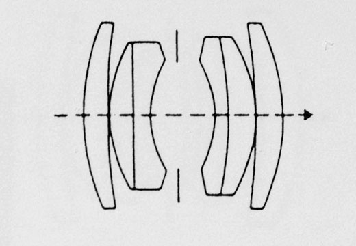 Doppio Gauss simmetrico, con 6 lenti in 4 gruppi, dotato di trattamento antiriflesso semplice.
